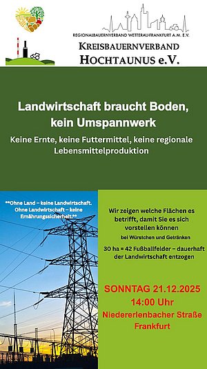 Das Umspannwerk soll eine Fläche von 30 Hektar umfassen. Hinzu kommt die gesetzlich vorgeschriebene naturschutzrechtliche Ausgleichsfläche. Der Kreisbauernverband Hochtaunus möchte über das Umspannwerk informieren und die Fläche mit Traktoren und Blinklicht umstellen, damit ersichtlich wird, wie weitreichend dieses Projekt sein soll.
